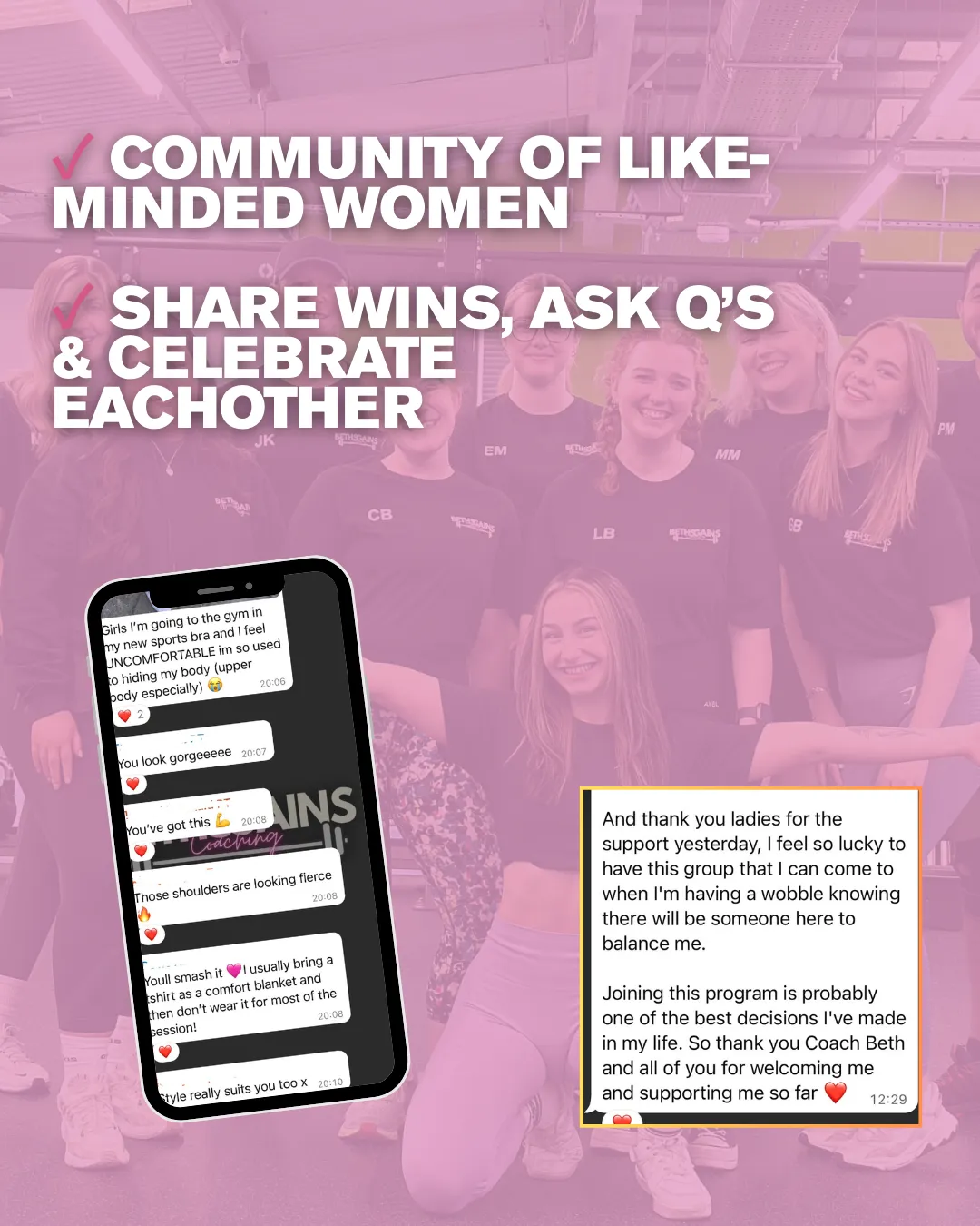 A supportive, empowering & high level space of like minded women sharing wins, staying accountable and getting strong together.
