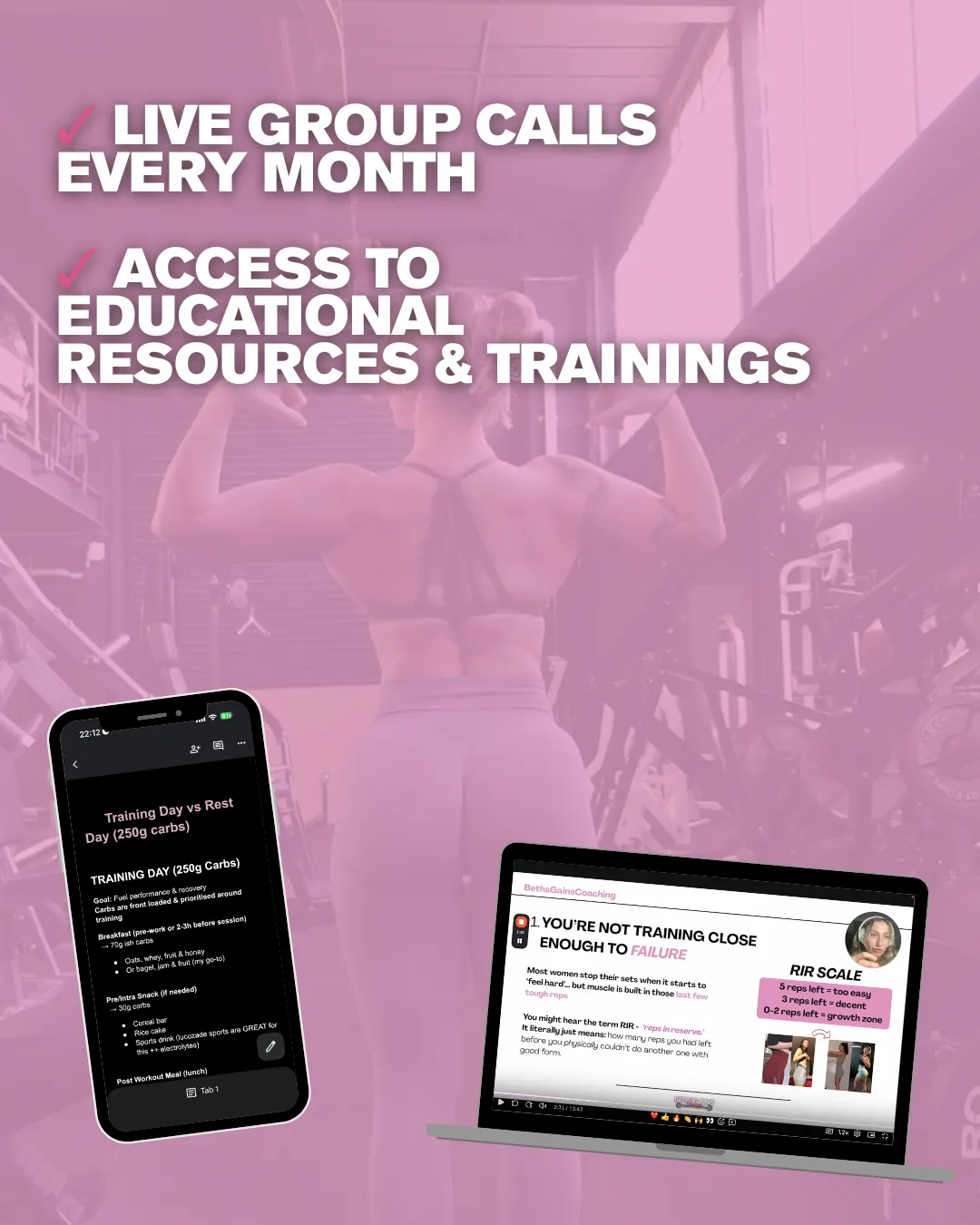 Education and guidance of both training and nutrition will be provided through the resources, live calls and mini trainings, but personalised nutrition coaching is part of 1:1 services.